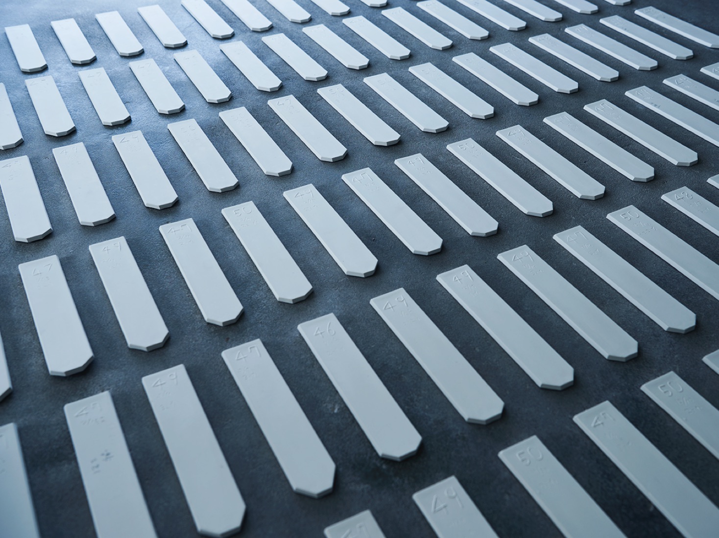 Prototyping plates with different pigments and mixing ratios. INAX continues the evolution of sanitaryware by developing the "new clay."