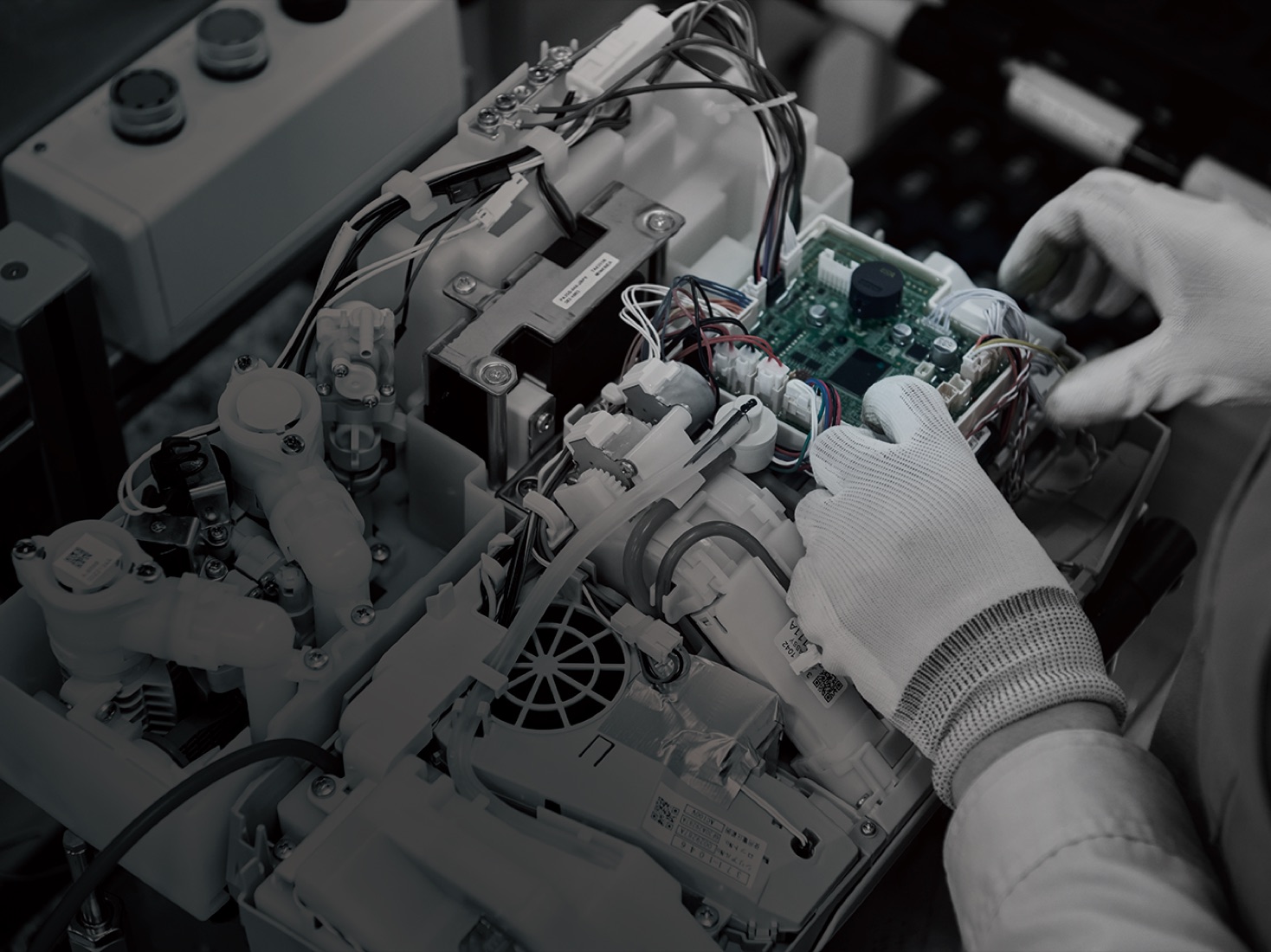 Assembling a shower toilet. In order to maintain accuracy and speed, INAX uses robot technology in addition to the eyes and hands of skilled technicians.
