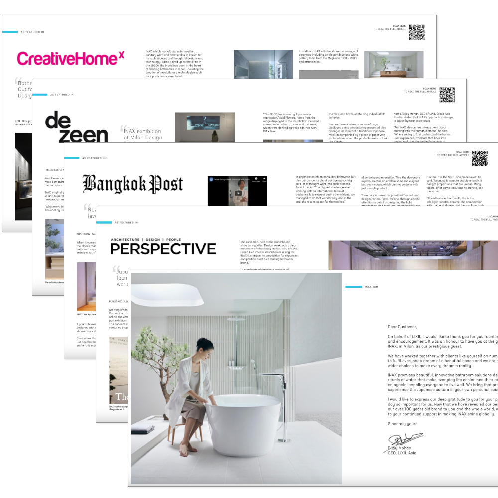 INAX “The Rituals of Water” Exhibition in Milan has inspired the well-known media infinite imagination of Japanese-style bathroom space and life and gained great coverage. This set great start for INAX global expansion and launch of S600 LINE and S400 LINE.