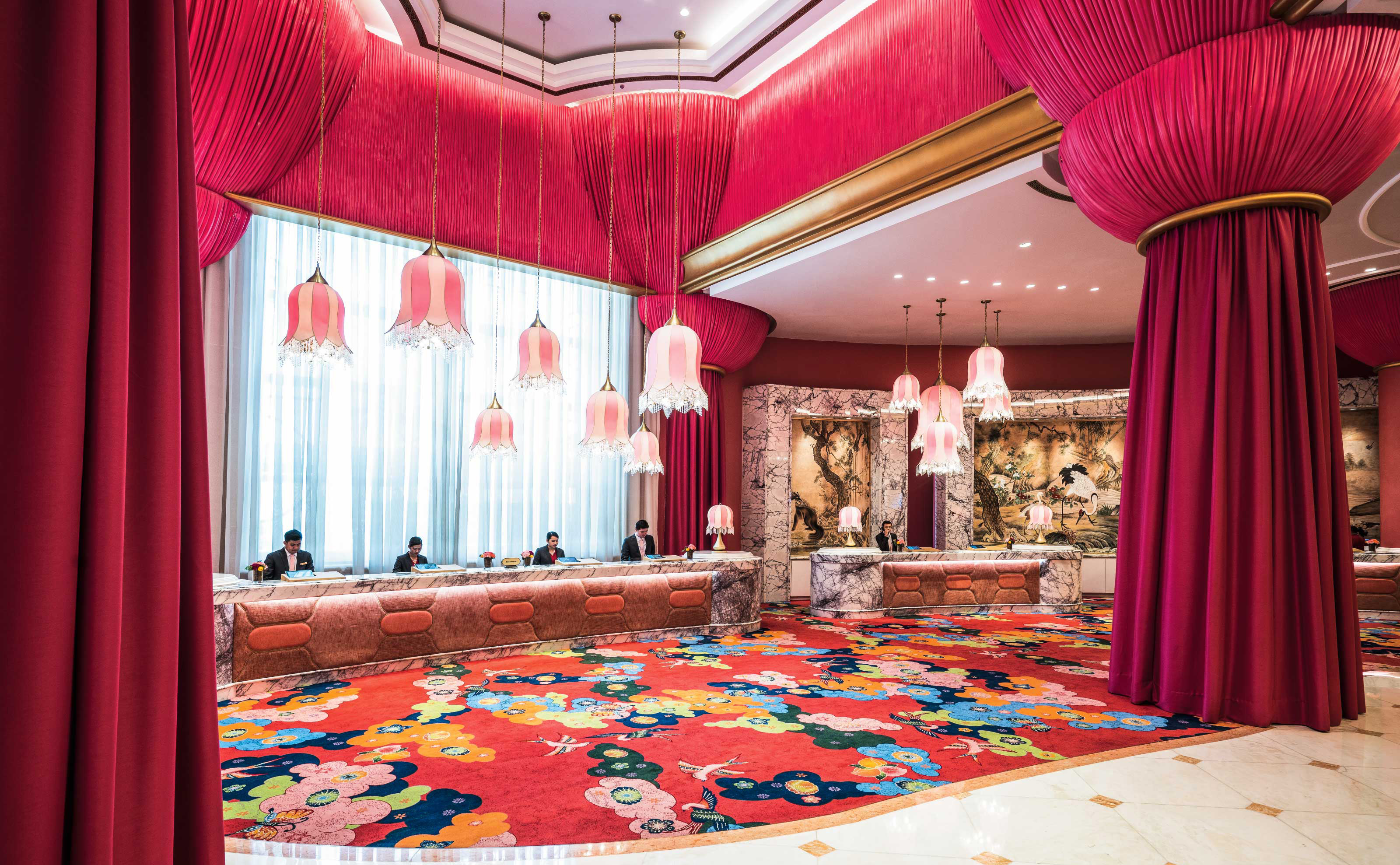 The lobby sets the tone for the hotel’s interior, and in choice of both colors and shapes, it’s unabashedly, gloriously over the top.