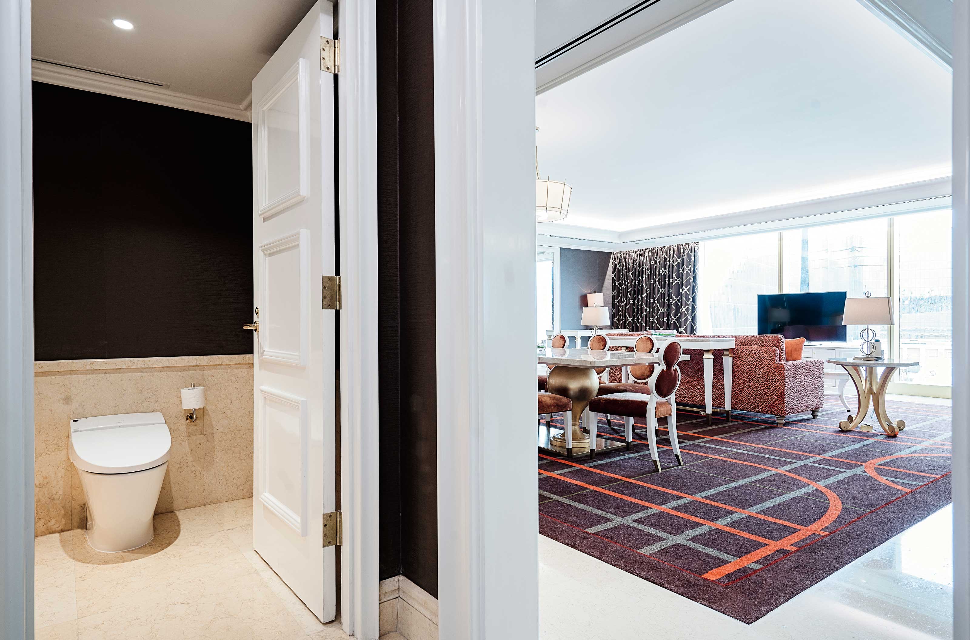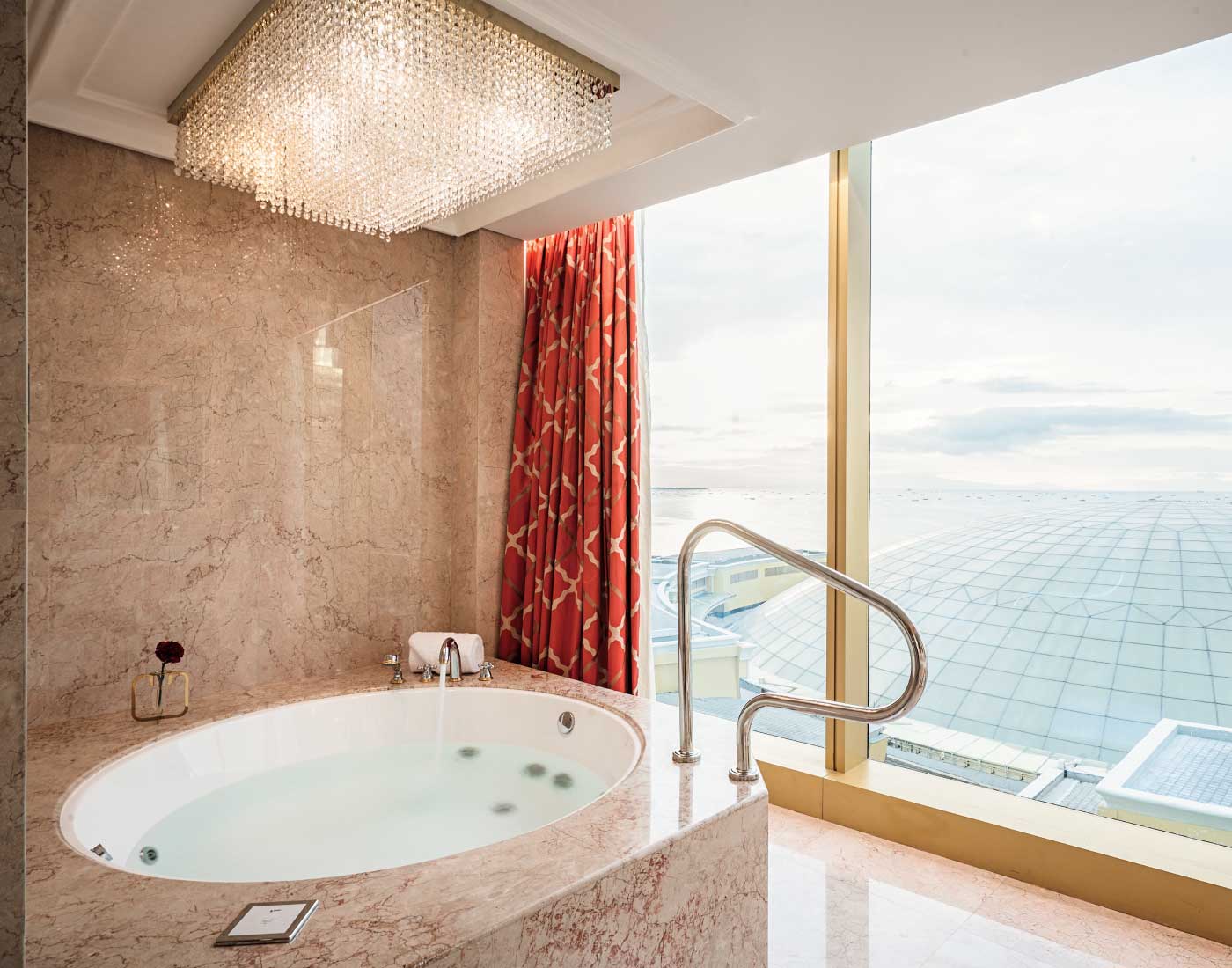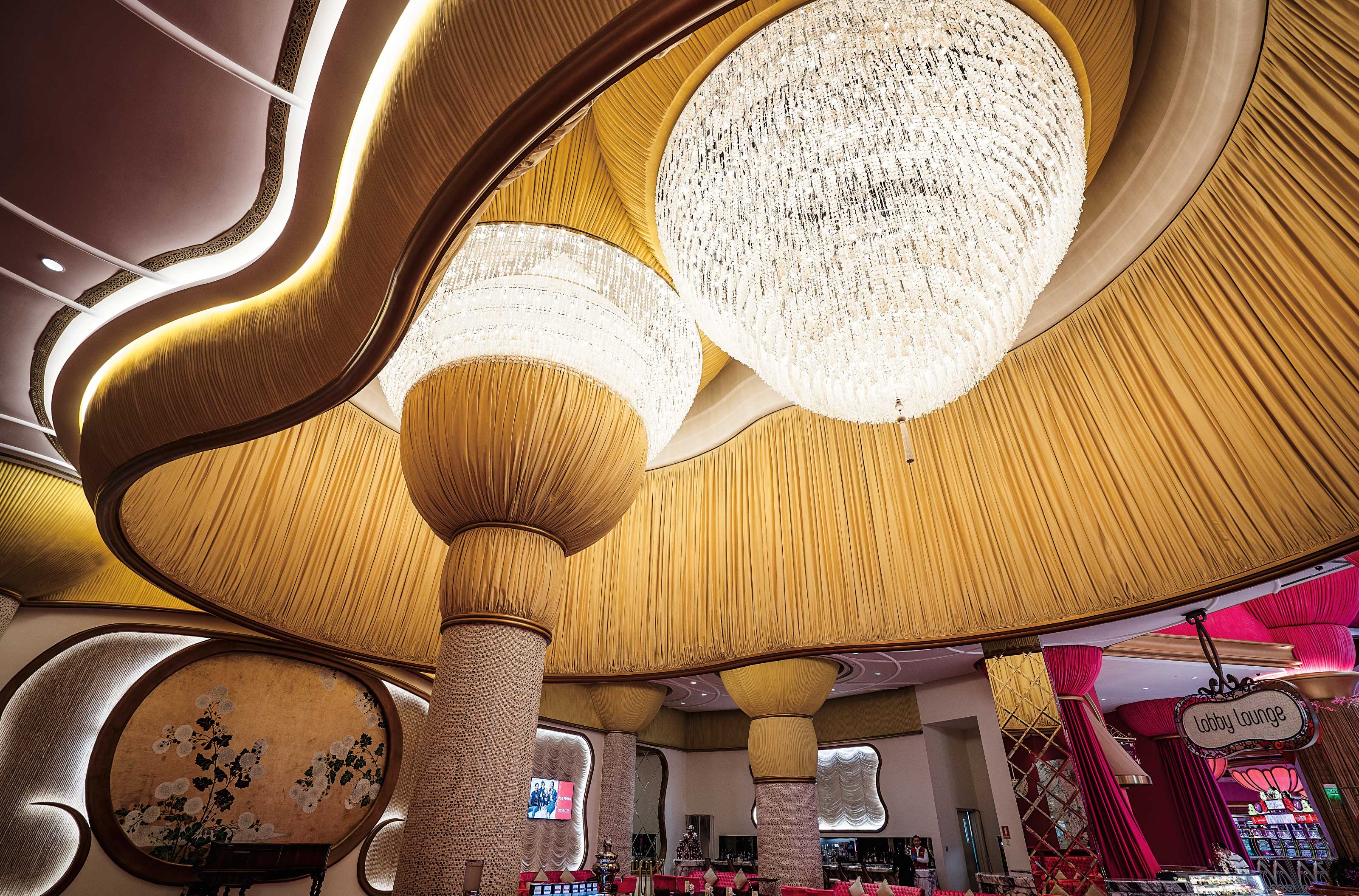 The guest rooms strike a more subdued tone. While there’s still plenty of pink, especially in the Neo-Victorian furniture, the overall color scheme is balanced by neutral browns and blues. The bathrooms are light and airy, thanks to large windows and an abundance of rosy, beachy marble – both of which remind visitors that the sands of Manila Bay are just outside. INAX’s Satis shower toilets were built in at the special request of the resort’s Japanese ownership, who felt they were essential to meeting the high standards of »Japanese hospitality« at the Okada. In fact, Pan-Asian elements are a visual motif here, whether it be Chinese lanterns, Japanese painted screens, or traditional geometric patterns in the Korean dining room. Given that the resort intends to pull in guests from across the continent, the diverse design scheme offers a little bit of everything – and, hopefully, something for everyone.
