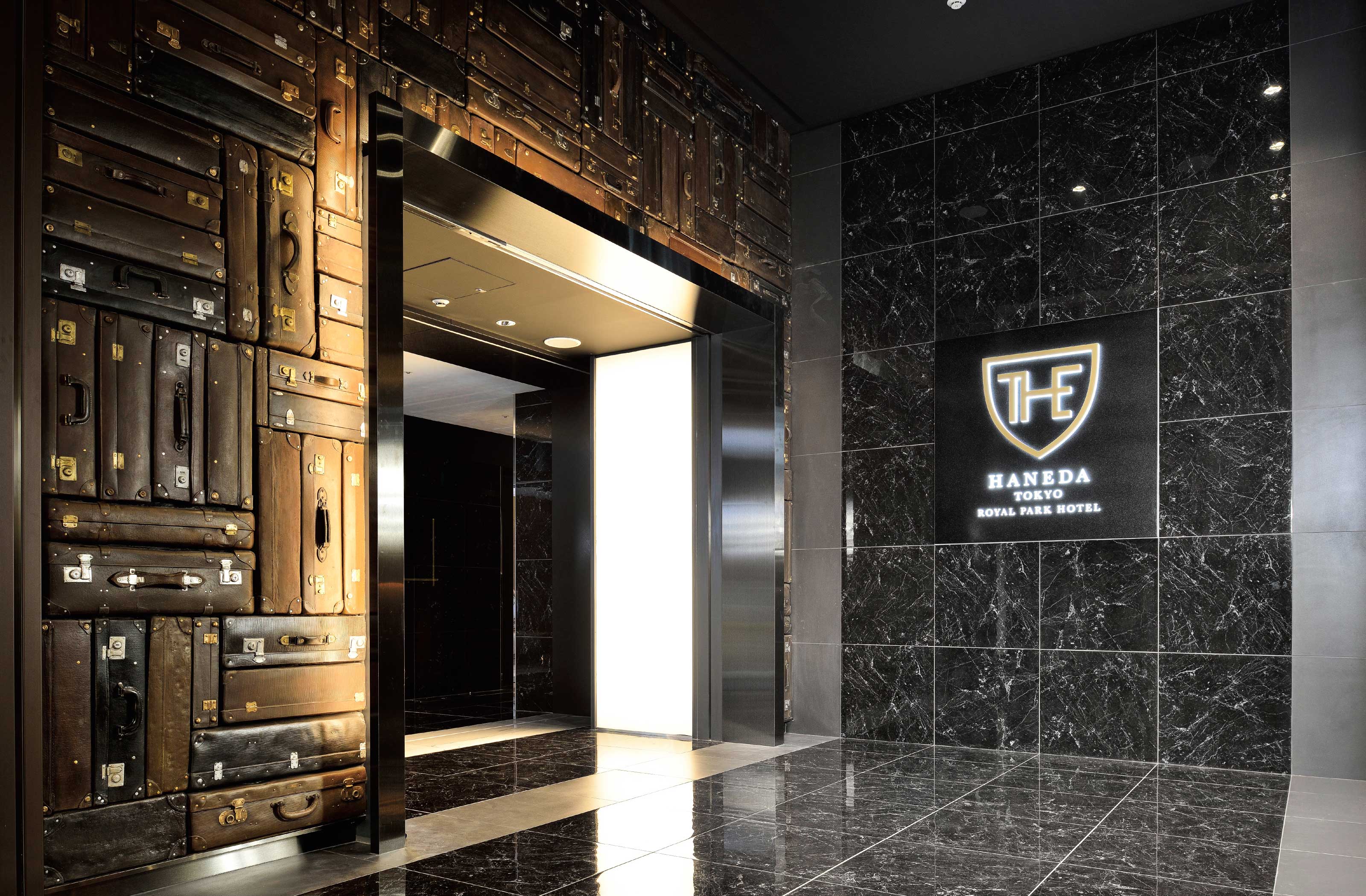 Guests enter The Royal Park Hotel Tokyo Haneda through a gateway built entirely of leather suitcases.