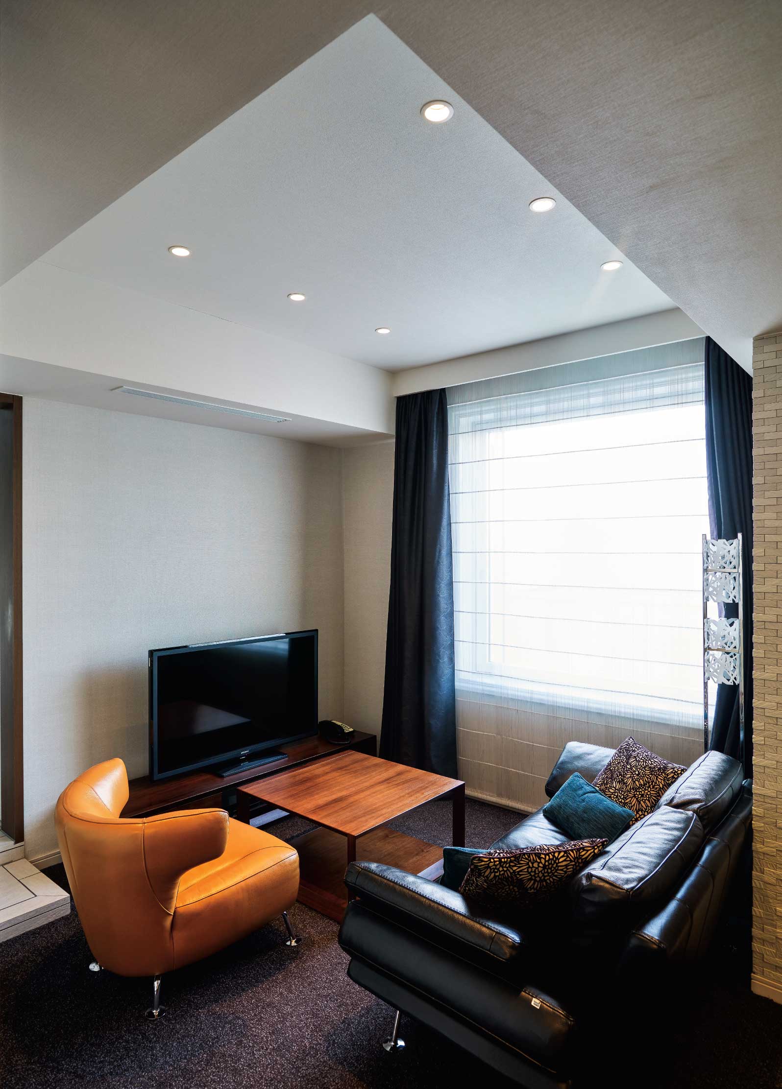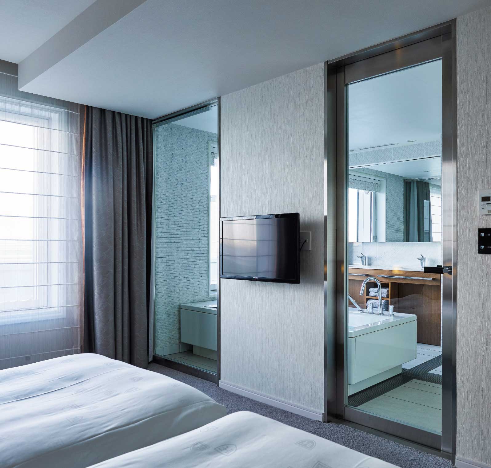Guests can overlook the airport from couches by Porsche and Ferrari designer Ken Okuyama. The transparent glass partitions between the bathroom and bedroom bring a sense of an integrated room.