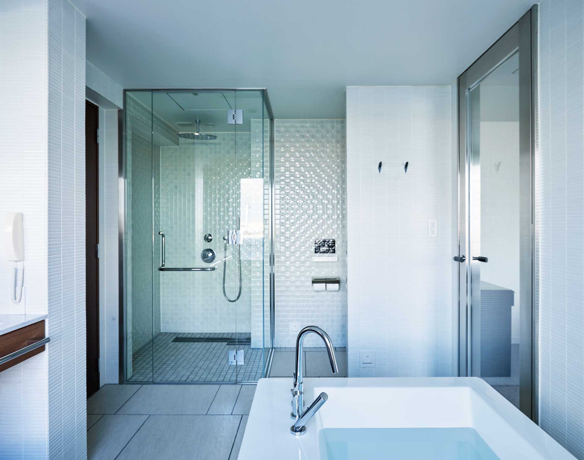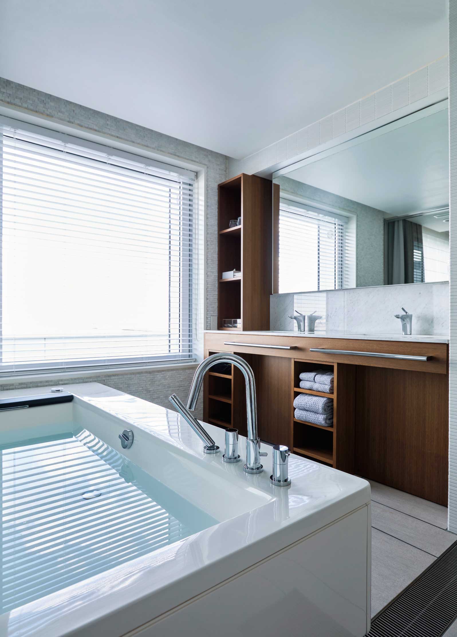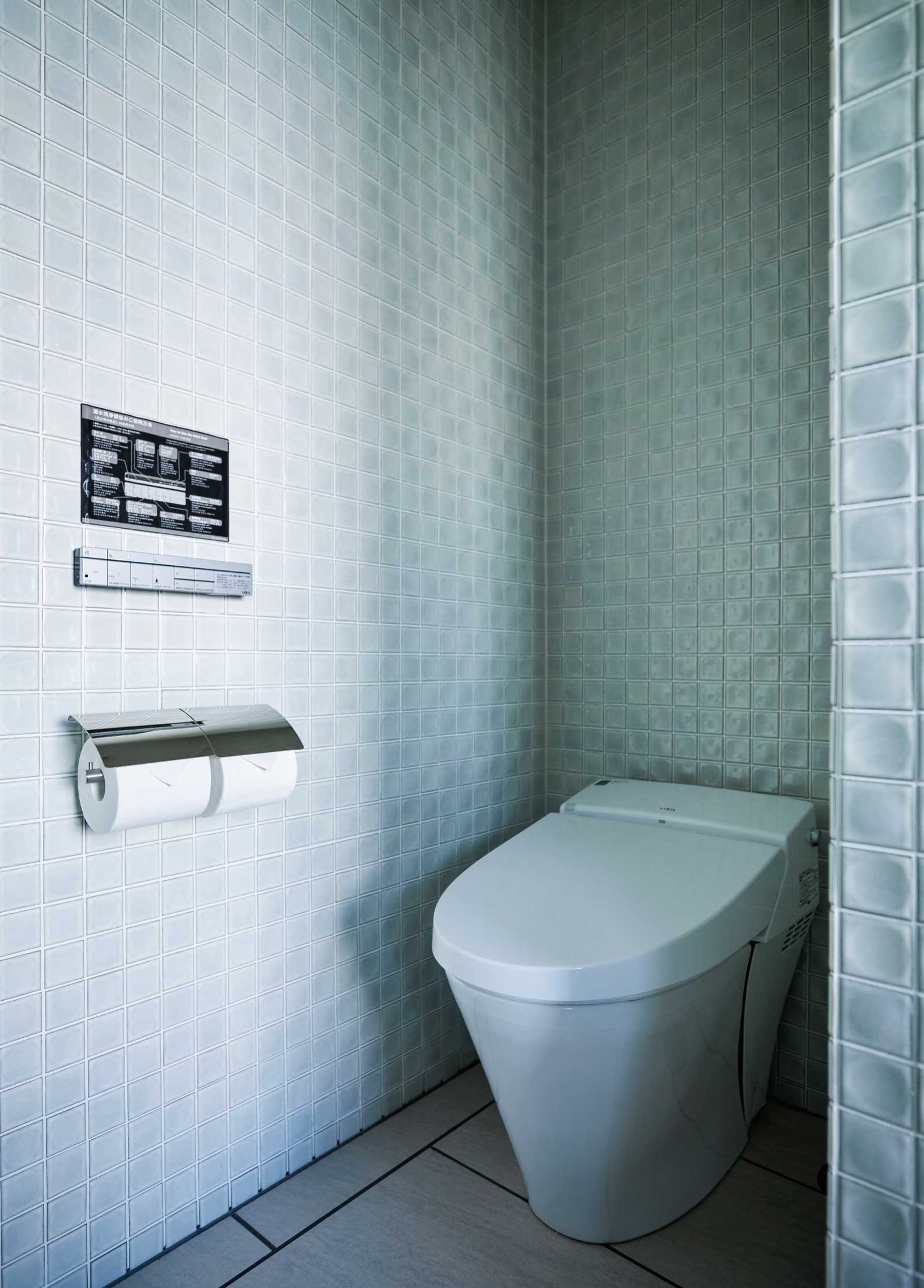 The bathrooms in the Home Spa Suite are fitted with INAX spa tubs and Satis shower toilets. Satis S and Satis G models were chosen for their functionality, reliability, and comfort.