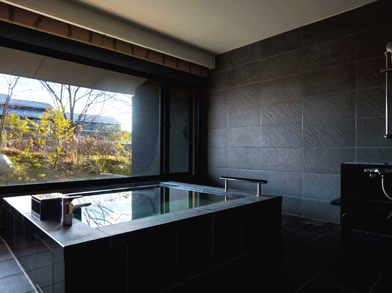 Yes, I used the same method. The bathwater actually comes directly from the hot spring, so you can enjoy the view outside and the hot spring inside at the same time. Also, everything from the ceilings to the height of the chairs is designed low. I structured the space low and flat, not as high as it would be in a western style.